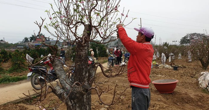 Cách đó không xa, bên vườn đào toàn gốc cổ thụ, ông Thiết cùng con trai cũng đang lẩn mẩn cắt cành. Vườn đào hơn 1 sào của gia đình ông Thiết trồng chừng hơn 60 gốc đào cổ thụ nhưng tới nay mới bán được 20 gốc, số còn lại đã nở bung hết, khiến cả nhà méo mặt.
