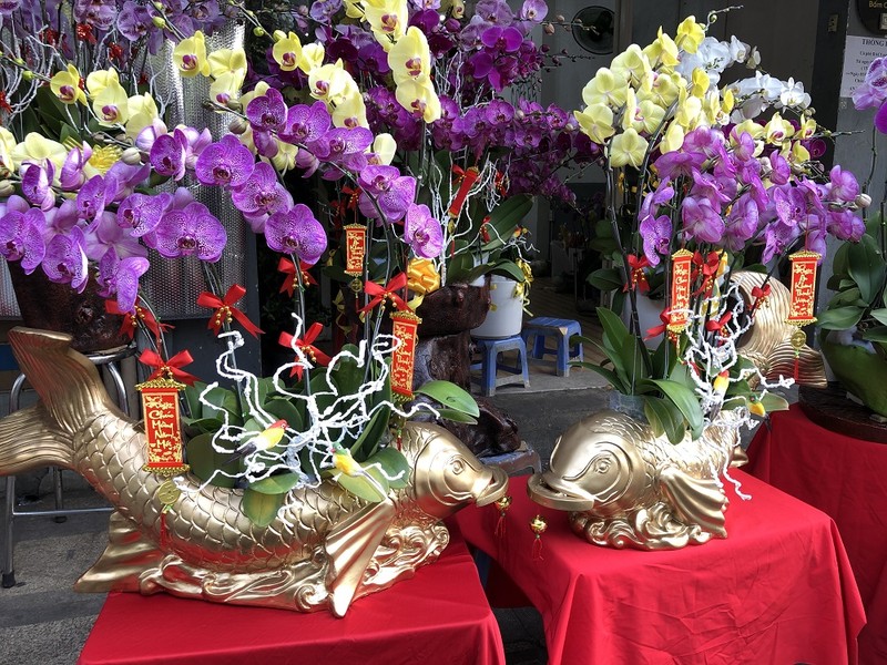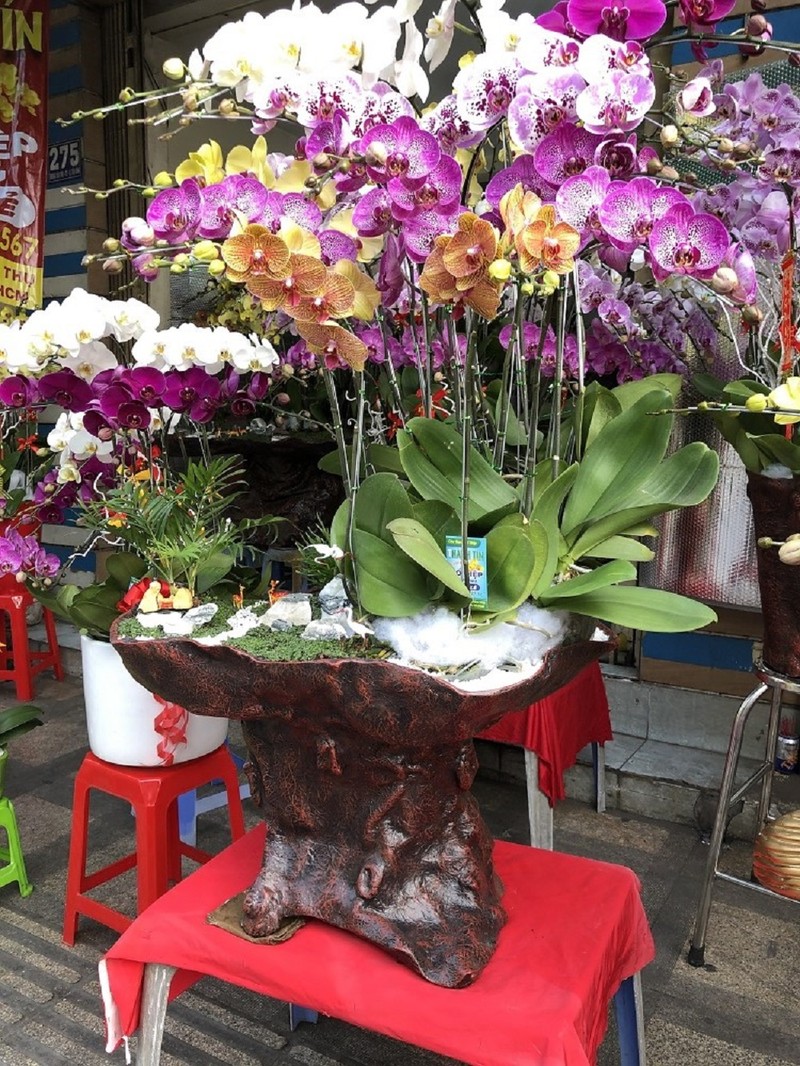 Các bình lan Tết này cũng đa dạng kích cỡ, hình dáng từ hình cá chép vàng đến con thuyền gỗ, đến những bình lan khủng có cả hòn non bộ.
