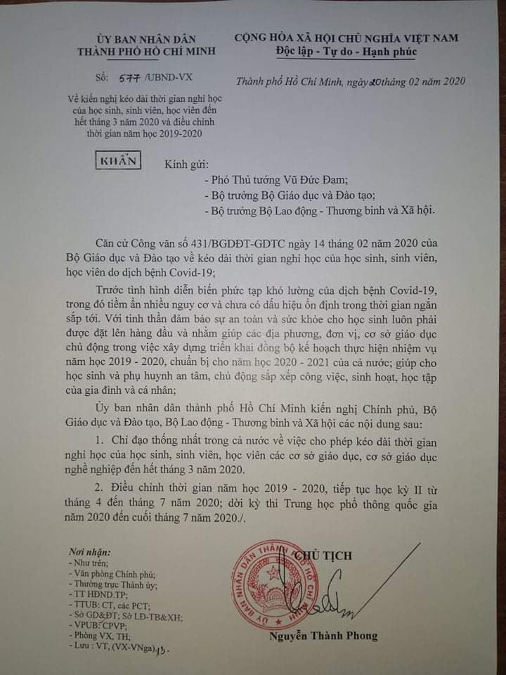 Trước đó, vào ngày 14-2, UBND TP đã có văn bản đồng ý cho học sinh, sinh viên toàn TP được nghỉ học đến hết tháng 2. Bên cạnh đó, UBND TP.HCM cũng cho biết sẽ kiến nghị lên Chính phủ, Bộ GD&ĐT để học sinh, sinh viên trên địa bàn nghỉ học đến hết tháng 3.