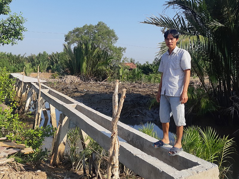 Anh Nguyễn Văn Thiện ở ấp Vĩnh Thạnh, xã Phước Vĩnh Đông, huyện Cần Giuộc, Long An đã vay mượn gần 70 triệu đồng xây dựng cây cầu bắc qua rạch để đi ra đường.