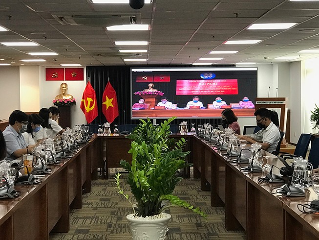 Cuộc họp trực tuyến tại điểm cầu Trung tâm Báo chí TP.HCM vào chiều 12-3. Ảnh: THANH TUYỀN