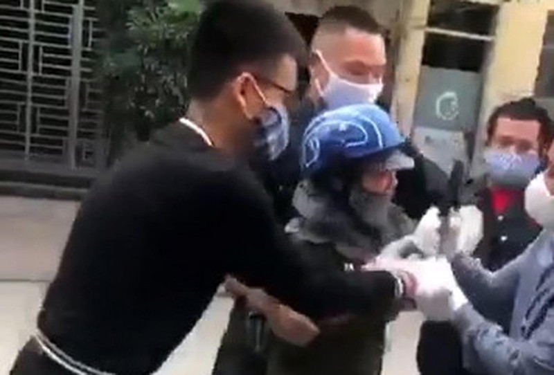 Chị bán rau bị lực lượng chức năng phường Bãi Cháy, TP Hạ Long (Quảng Ninh) khống chế. Ảnh cắt từ clip.