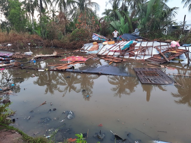 Đến chiều 25-4, lực lượng công an, quân sự và chính quyền xã Vân Khánh, huyện An Minh, Kiên Giang, vẫn đang giúp dân khắc phục nhà ở do thiên tai gây ra từ ngày hôm trước.