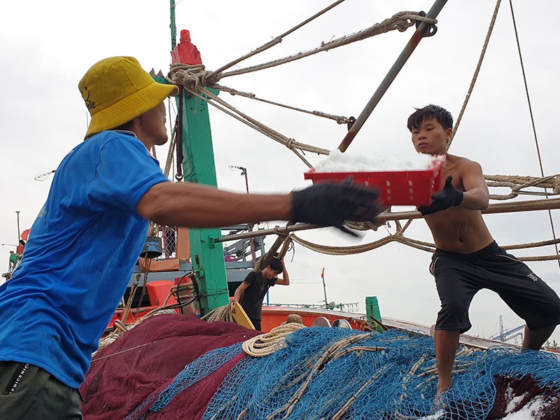 Ngư dân đang tất bật với những công việc cuối cùng trước khi toàn bộ hoạt động ở cảng cá Bình Định được tạm dừng. Ảnh: TÂN - VŨ