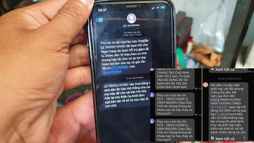 Ông H (ngụ phường 10, quận Tân Bình, TP.HCM) liên tục bị khủng bố qua điện thoại, tin nhắn, cuộc gọi với nội dung đòi nợ rất tục tĩu như: “Mày mua (...) dán lên bàn thờ thằng cha con mẹ mày để che cái bàn thờ nhà mày lại cho thiên hạ khỏi dòm ngó, bàn tán về số nợ của mày...”.