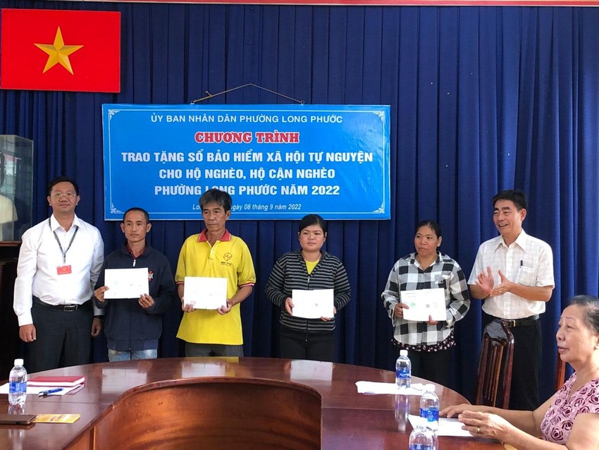 Sáng 8-9 có 22 người dân thuộc hộ nghèo, cận nghèo tại phường Long Phước đã được trao sổ BHXH tự nguyện với thời gian tham gia BHXH là sáu tháng.