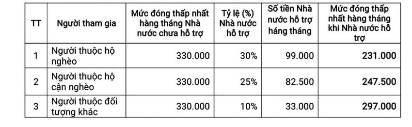 Cụ thể, mức đóng BHXH tự nguyện tối thiểu của người dân sau khi áp dụng mức hỗ trợ của Nhà nước như bảng sau: